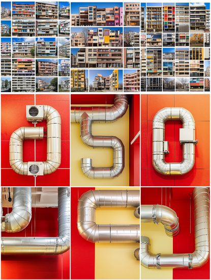 In a surreal classroom, the HVAC system speaks in typographic forms. Letters emerge in aluminum—O, S, G. Are these ducts? Or coded messages? The infrastructure becomes communicative, speculative, and strangely poetic.