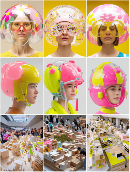 Caption: Inflatable hair-helmets in glossed yellow and pink, captured in silent portraits from behind. Each dome speaks like a thought bubble: soft, assertive, generous. This is protection not from danger, but from despair. A new kind of crown for the cautious optimist.