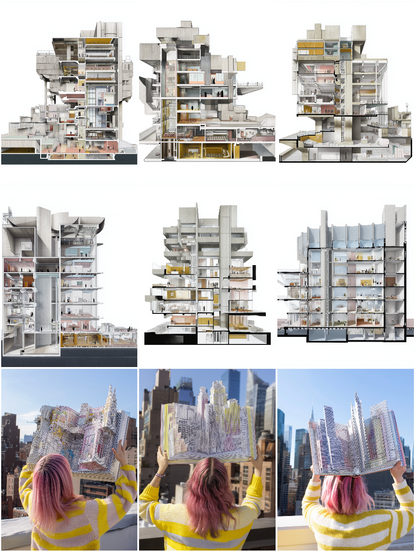Bottom Right: A rooftop reader unfolds an architectural pop-up book above the skyline.
