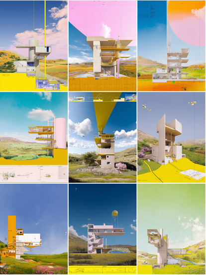 Welcome back to another vibrant volume of the Surjan Super School newsletter, where architectural education blossoms in the wild garden of digital storytelling, speculative realism, and surreal utopias. This week, we float above, dive below, and scale into the inner nerves of the vertical city. Our visual archive is a dream atlas composed of light-filled architectural sections, candy-hued towers, inflatable headdresses, pastel-plated pipes, and rooftop landscapes glowing in optimistic yellow and pink.