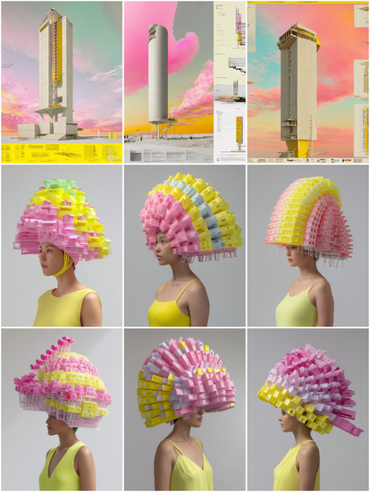 Image 55–63:Imagine buildings not as structures to inhabit, but as personas worn on your head. In these portraits, models wear exuberant headdresses crafted from architectural fragments—tiny pink towers, yellow balconies, and entire stairwells curl like coiled locks.