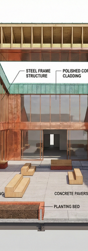 The Copper Courtyard: Even the simple act of looking across a courtyard is elevated when the "Steel Frame Structure" is wrapped in "Polished Copper Cladding," reflecting the "Brick" walls and "Double Glazed Skylights".