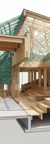 The Tiered Hearth: We see this community focus again in the "Copper Shingle Cladding" project. The section reveals a beautiful topographic floor of "Wooden Interior Millwork & Bookshelves" acting as stairs, seating, and desks all at once.