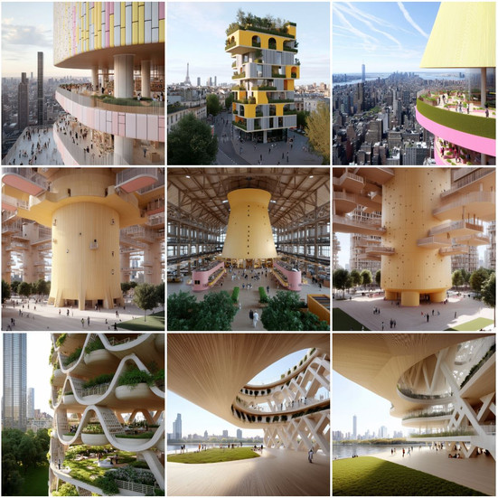 Urban Arches and Vertical Forests A new take on urban architecture with curving facades and lush greenery. These designs emphasize the interplay between dense cityscapes and natural environments, redefining sustainable urban living.