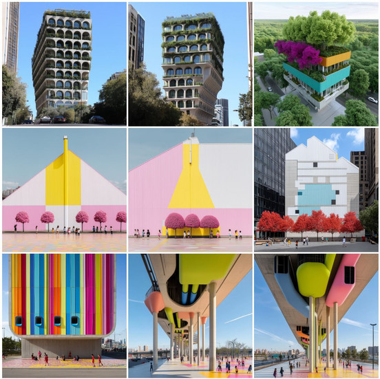 Middle Center: Vibrant pink treetop buildings challenge traditional verticality and inject color into the skyline.
