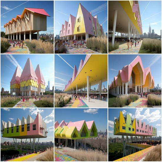 Image Caption: Vibrant structures with scalloped rooftops and elevated platforms bring a sense of whimsy and lightness to urban landscapes, merging architectural form with surrounding natural environments.