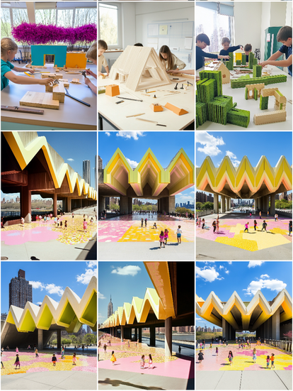 Caption: From rooftop classrooms to rewilded interiors, young designers construct futures from blocks, twigs, foam, and cardboard.